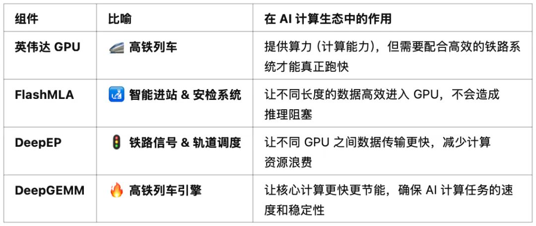 可以把整个 AI 计算生态比喻成一个超大型的高铁网络 ,其中英伟达的 GPU 就是高铁列车,而FlashMLA,DeepEP和DeepGEMM 分别解决了高铁网络中的关键环节,使整个系统运行得更高效、更顺畅。